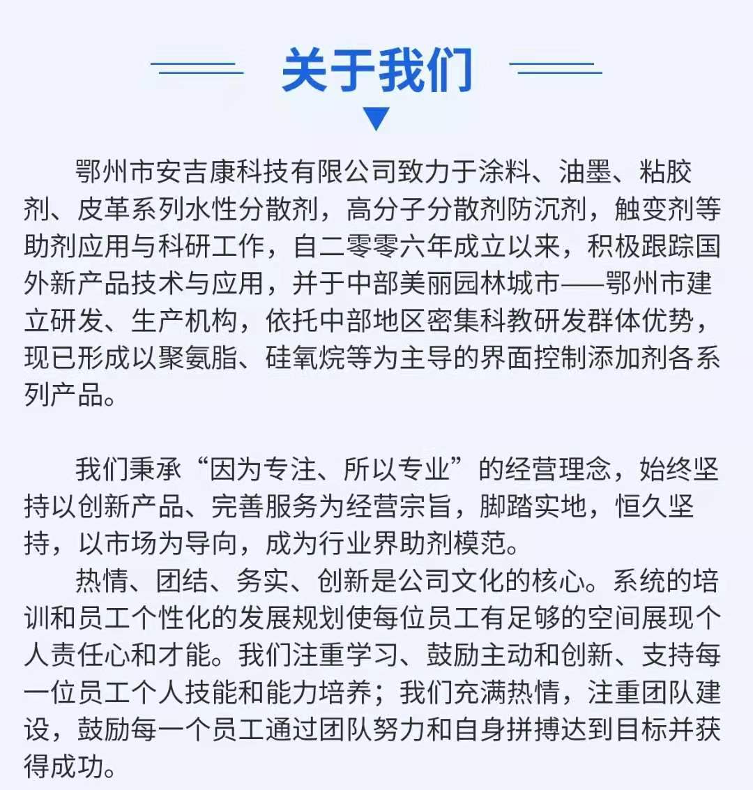 安吉康6502啞粉專用潤(rùn)濕分散劑主要適用于溶劑型或UV體系涂料、針對(duì)啞粉和無機(jī)顏料的分散劑